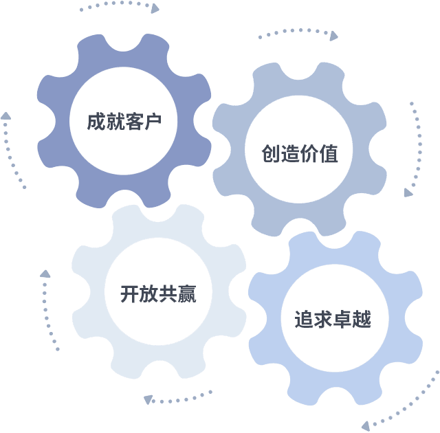 成就客户是一切决策的出发点,,创造价值是衡量所有工作的标准,,追求卓越是我们做事做人的态度,,开放共赢是我们的格局也是最终的结果。。。价值观的齿轮环环相扣,,,推动着组织里的每个人不断向前。。